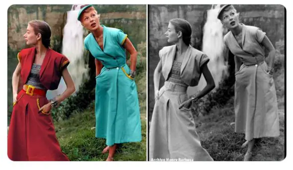 El único registro fotográfico que queda de este evento, captado por Henry Barbosa, muestra a dos modelos en atuendos que encarnan la visión de Dior. Una de ellas luce una falta ancha roja con un cinturón marrón, combinada con una blusa a rayas y un torero corto con hombreras doradas; la otra, vestida con un sombrero pequeño, un vestido azul con cuello tipo narrow y cuatro botones plateados en el torso, llega hasta el tobillo. Estas imágenes no solo capturan la moda de la época, sino también la fusión entre lo natural y lo sofisticado.